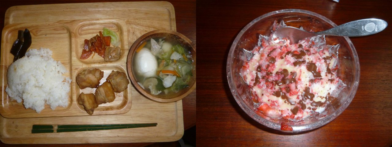 てな訳で、昼ご飯は、タイピーエンと鶏からのレモン煮。タイピーエン、適当やけど、旨いわ。右は、イチゴを凍らせて、その固まりをそのままかき氷器にかけたもの。美味しいけど、コストパフォーマンス劣悪のため、量産化不可の一度きりメニュー。