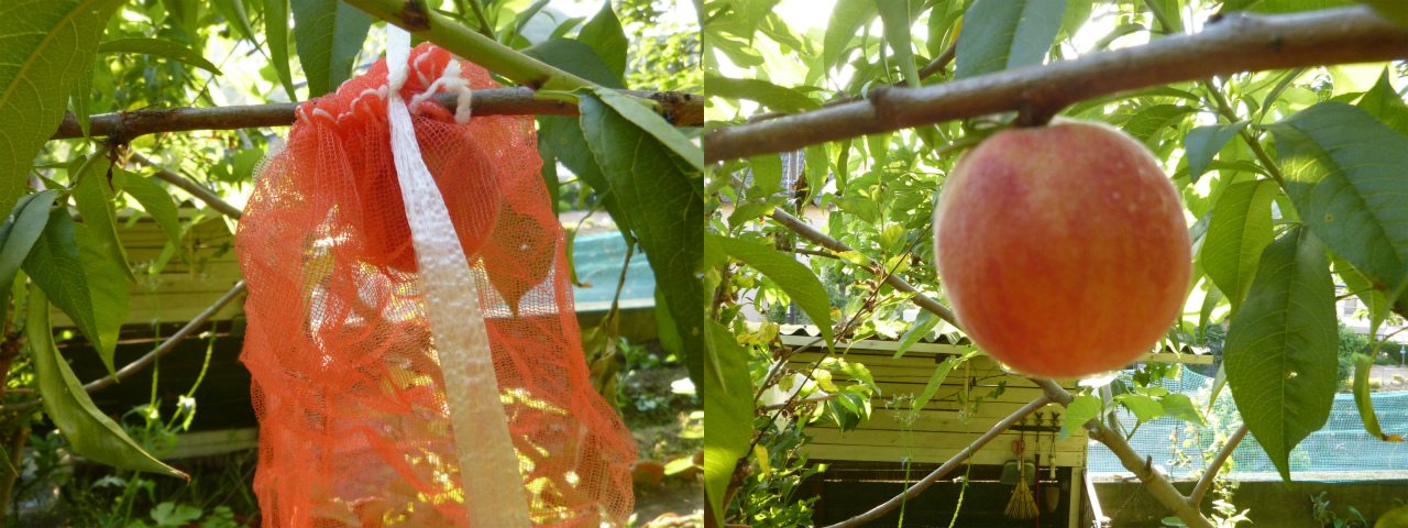 うげー、しまった!桃の極々早生品種「ひめこなつ」の熟期であることをスッカリ忘れていた。袋を外して日光に当てねばいけなかったのだが、袋の中でカビていた。唯一残った1個の袋をネットに交換し、日光に当てるの図。