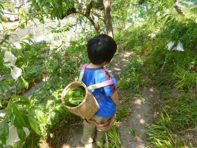 と言う訳で、柿の若葉が出てきたので、収穫籠を息子はんに背負わせて収穫。