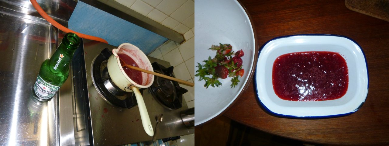 イチゴは完全無農薬の露地栽培なので、全てが綺麗ではない為、馬鹿丁寧に洗われた後(ビタミンCの損失は気にしない)、生食用と加工用に分けられる。で、出来の良い奴は、そのままで食べれば良いのに、邪道法にはまる。5月17日(日)