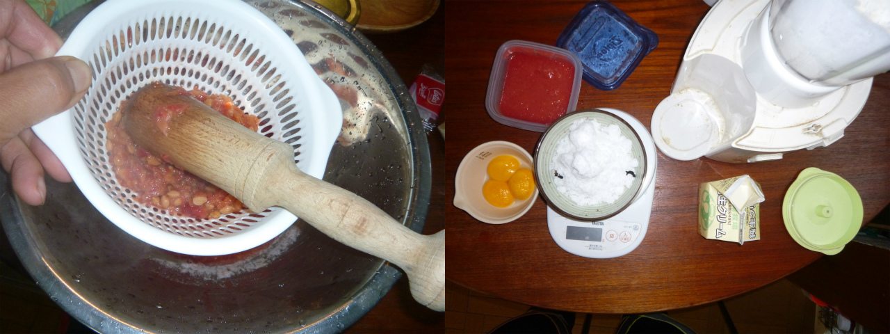 採れたてのチェリーを濾して、チェリー味のアイスクリームを作った。ミキサーがあれば、アイスクリーマーも攪拌も不要なのだ。