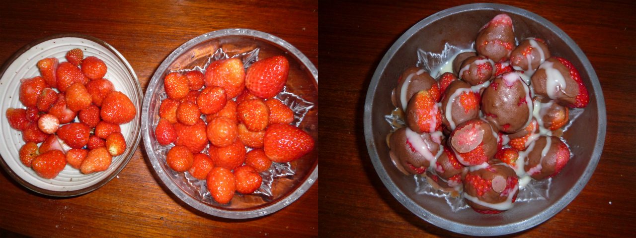 イチゴがそこそこ採れだしたので、練乳と冷やすと固まるチョコをかけて、冷蔵庫へ。何もかけずにそのまま食べるべきだが、この邪道が旨いこと。