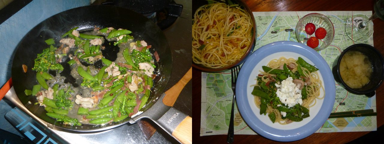 ブロッコリーやエンドウ豆などの春野菜を滞りなく消費しないといけない。と言う訳で、春野菜のペペロンチーノを作る。