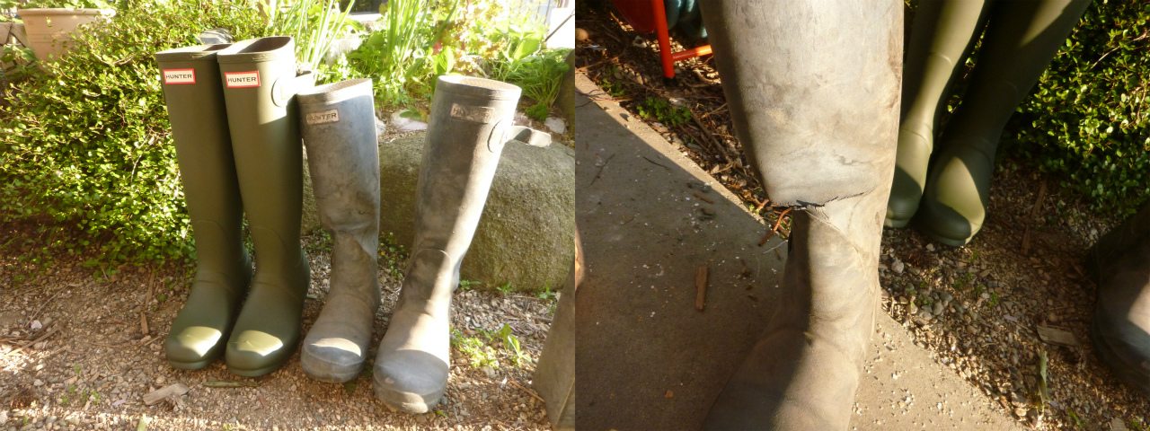 庭を造るようになって6年目。その間、2足、ハンターの長靴を履き潰した。かかとが取れてそこが磨り減るほど酷使した。某量販店で、ネット価格よりも遥かに安く売られていたので新しいのを購入したが、以前の2足と異なり、内側に布が張られていないので蒸れる!しかし、それでも他の長靴よりもヘビーデゥーティー。