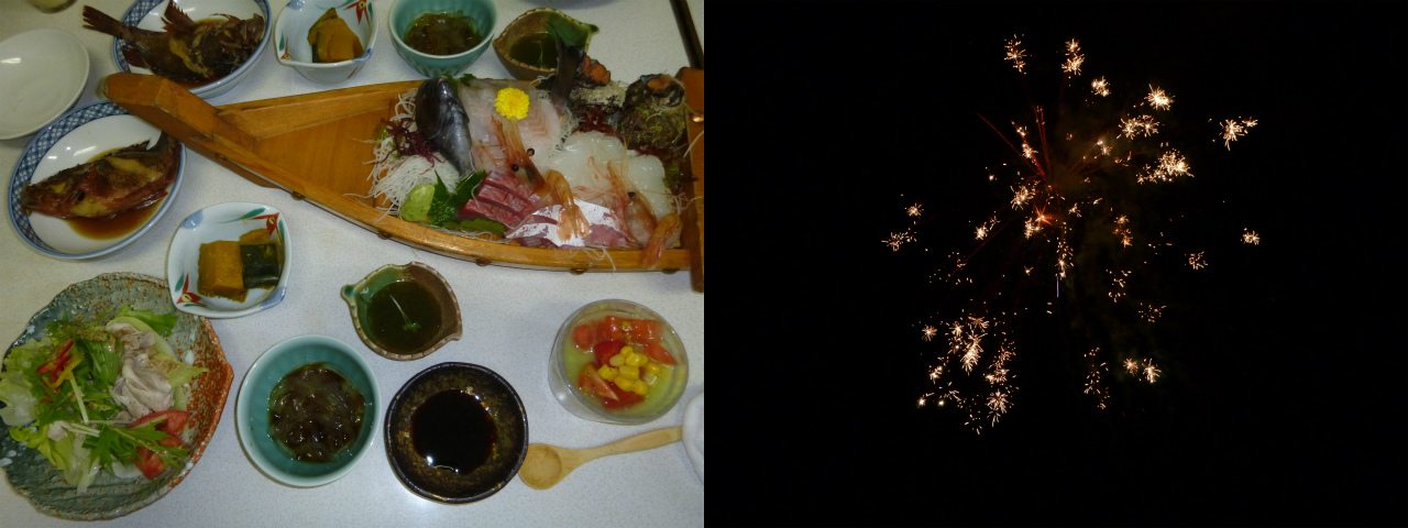 スピアフィッシングとタラソテラピーが目的でグルメは目的ではないが、折角なので夜は舟盛りにしてもらった。たまたま、お祭りと重なっていたために、夕食後に散歩を兼ねて見物に。大きな花火ではなかったが、工夫が凝らされた物を間近で観られたので、期待値の10倍以上の満足。