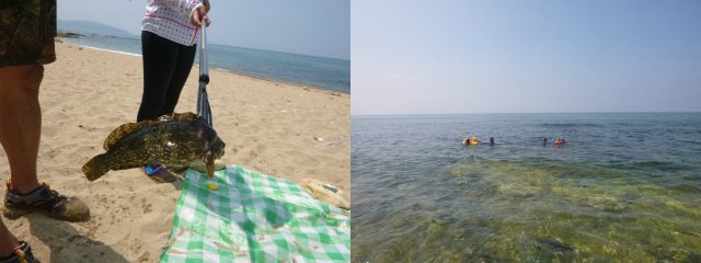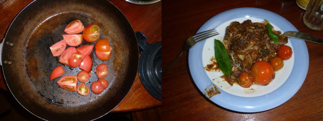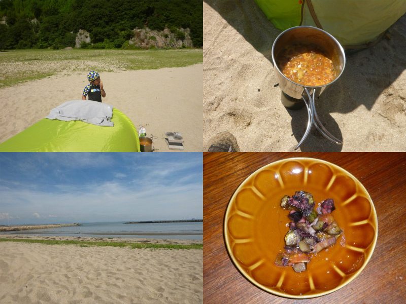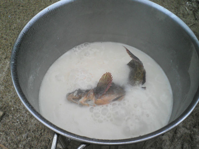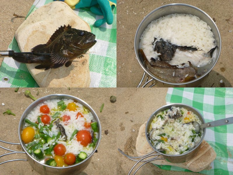 カサゴなどを突き、刺身にして食べ、残りの部分をタイ米と共に茹でる。更に家から持参したトマトなどを加えて一煮立ち。イタリアの漁師飯っぽい感じで自分では美味しいと思ったが、子供達にはタイ米がえらく不評で余ってしまった。