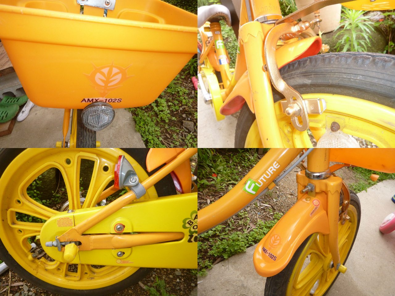 友人から息子はん用にもらい受けた自転車のサビを落とし、研磨剤で磨き込む。オレンジ色はメタスっぽいが、メタスは女っぽいイメージがあるので、ZZあんまり知らんけど、ここはズサで行こう!と言う訳で、ブレーキを分解、さび止め、調節し、部分的に再塗装後に耐水シールを作成し、各種マーキングを施した。