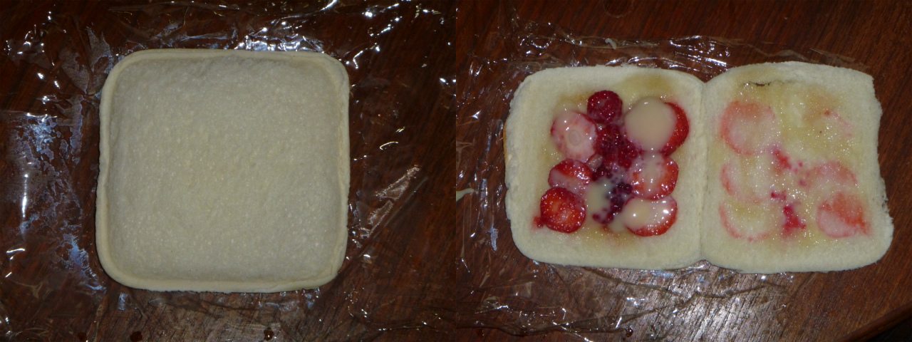 四季なり苺がペチペチと採れるので、ラズベリーと一緒にパンに乗せて練乳をかけ、サンドメーカーでフルーツサンドを作った。