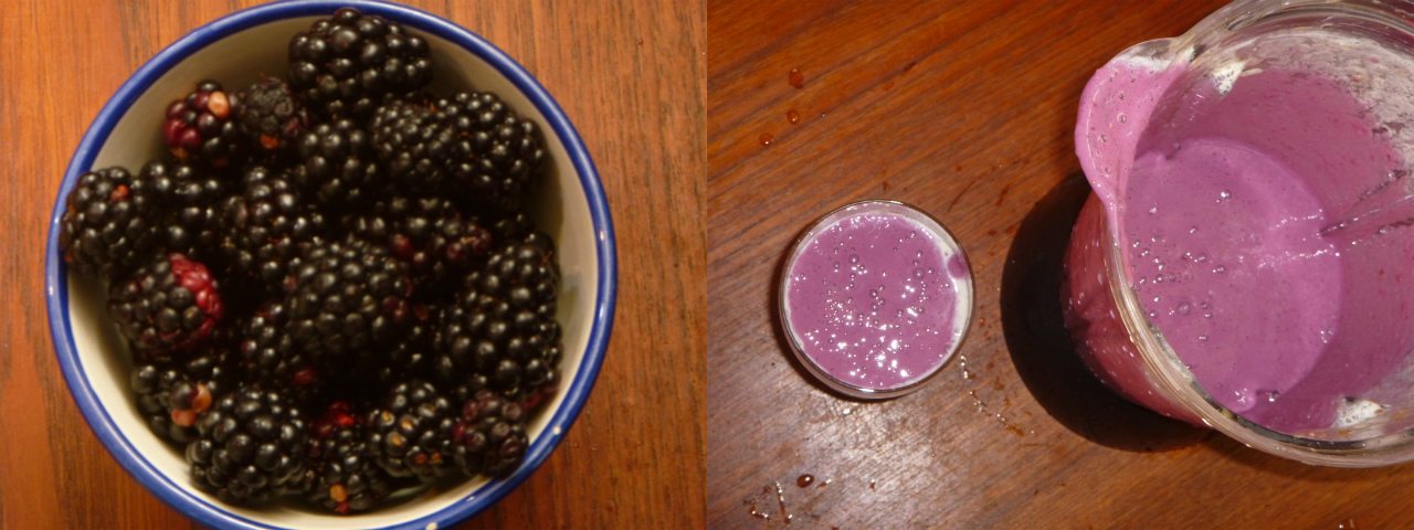 今年最後のちよひめと豆乳ヨーグルトとミキサーぶんぶんしたブラックベリーシェイク。タンパク質は相も変わらず目玉焼き。