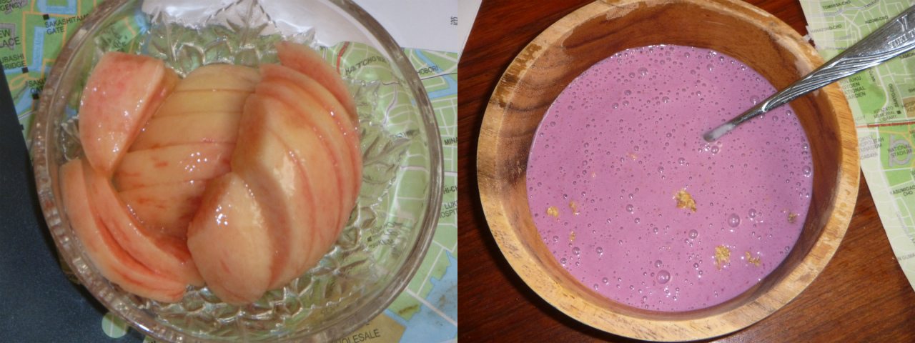 夜までに凍らせて保存するのを忘れて、微妙な感じになってしまったブルーベリーや苺を豆乳などでシェイクして食パン代わりの炭水化物源と成す。タンパク源は決まって目玉焼き。