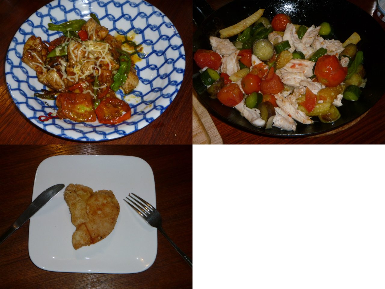 昼、家に誰もいなかったが、自分の為にトマトの赤色がからんだヘルシーっぽいチキンステーキを作った。つもりであったが、何だか不気味な色味に。