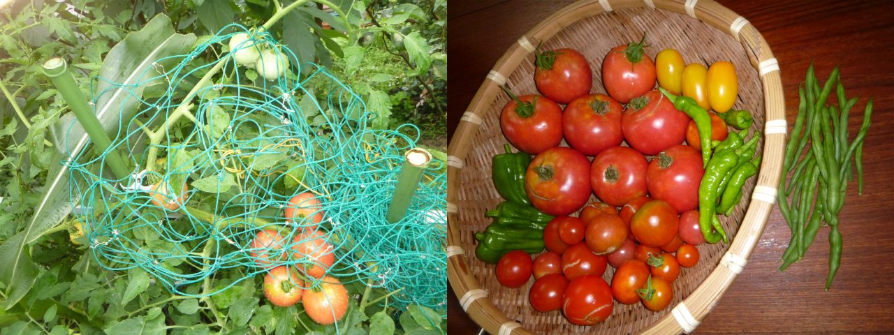近年はトマト作りに情熱を注いでいないが、お高い接ぎ木でもない実生や脇芽からの苗が順調に実を付けてくれた。写真はカラス除けネット。