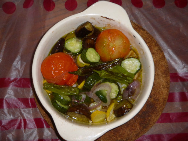 一晩寝かせて、いよいよ仕上げ。ズッキーニやパプリカなど、あるものを適当に採って来て投入。ただし、茄子は肉汁を染み込ませてから入れる。