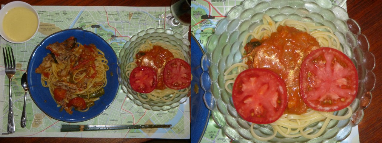 昼。昨日のトマトソースの余りを利用して、パスタをこさえた。一つはトマトソースをベースにした肉パスタ。もう一つは、トマトソースに一切手を加えず、そのままをぶっかけた冷製パスタ。