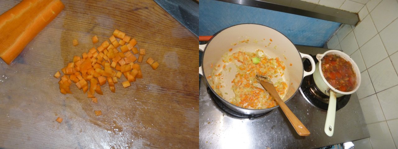 娘さんだけでなく、野菜を食べない息子はん対応にすべく、野菜は小さく刻む。野菜を炒めつつ、煮込んだスジ肉にトマトを加えて更に煮込む。