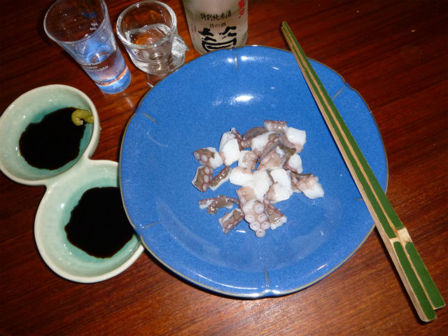 夜、帰宅後、最初に取りかかったのは、荷物の片付けでもなく、洗濯でもなく、タコの調理。ヌメリをとってさばいてから、最も元気な1匹を除いてボイル。件の一匹は刺身にし、この日の為に用意しておいた辛口の純米酒で頂く。