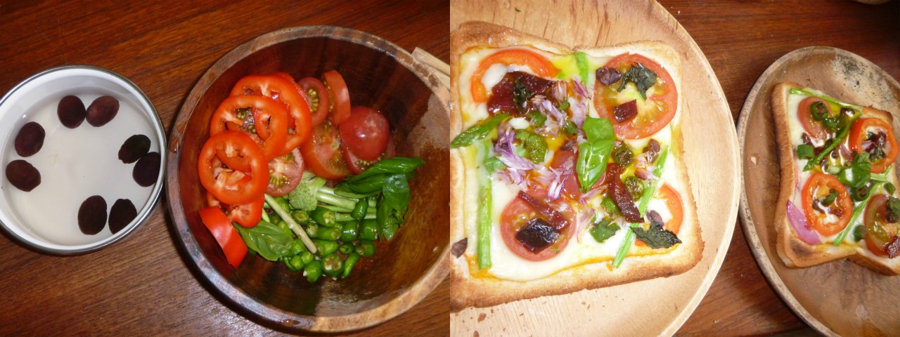 起床した時点で、無性にピザが食べたかったので、黙々と準備。わざわざパプリカやアスパラを採って来て、塩抜きしたオリーブを隠し味に。