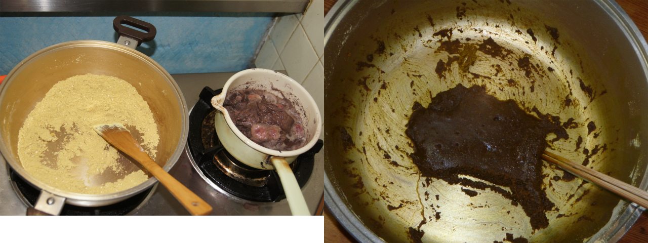 明後日の給食は「夏野菜のカレー」。ってな訳で、お安いスジ肉をワインで煮込む傍ら、カレー粉と小麦粉を混ぜ混ぜして発酵バターで丁寧に炒めて、カレーの元を作る。