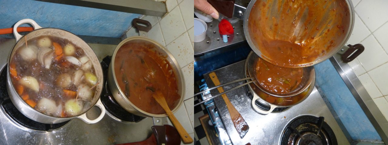 メインの鍋に、野菜を投入し、アクを取りながら煮込む。ブラウンソースとダシソースを合体させて馴染ませる。最後に混ぜたソースを濾しながらメインの鍋に流し込んで完成。