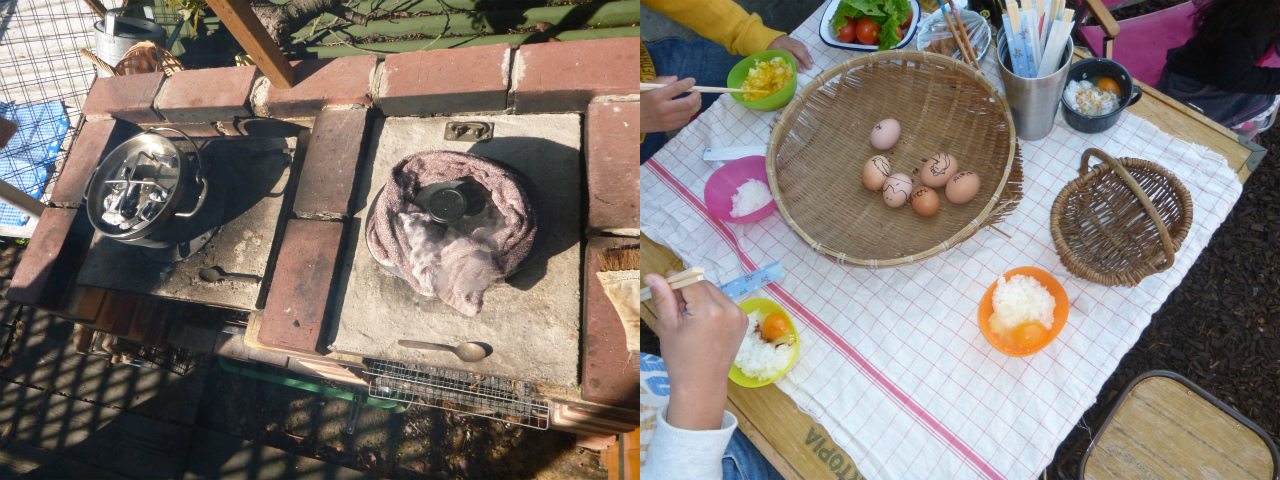 お米と野菜のアヒージョの出来上がりを待つ間、鶏小屋へ行き、自分が食べたい卵を取ってきて、マーキング。釜炊きご飯に産みたて卵を乗せて頂きます。ダッヂオーブンで焼いたトマトが美味しかった。