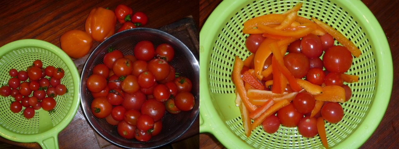 野菜タップリ肉チョットの精神で、庭野菜のアヒージョがおかず。パプリカやトマトなどの色素の多い野菜を沢山食べると、何故かスッキリする。