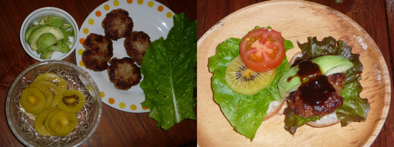 当然、晩ご飯には間に合わないので、夜はハンバーガー。余り気味のトマトと菜っ葉を採って来て、ゴールデンキウイとアボカドを挟むと、異様な美味しさ。