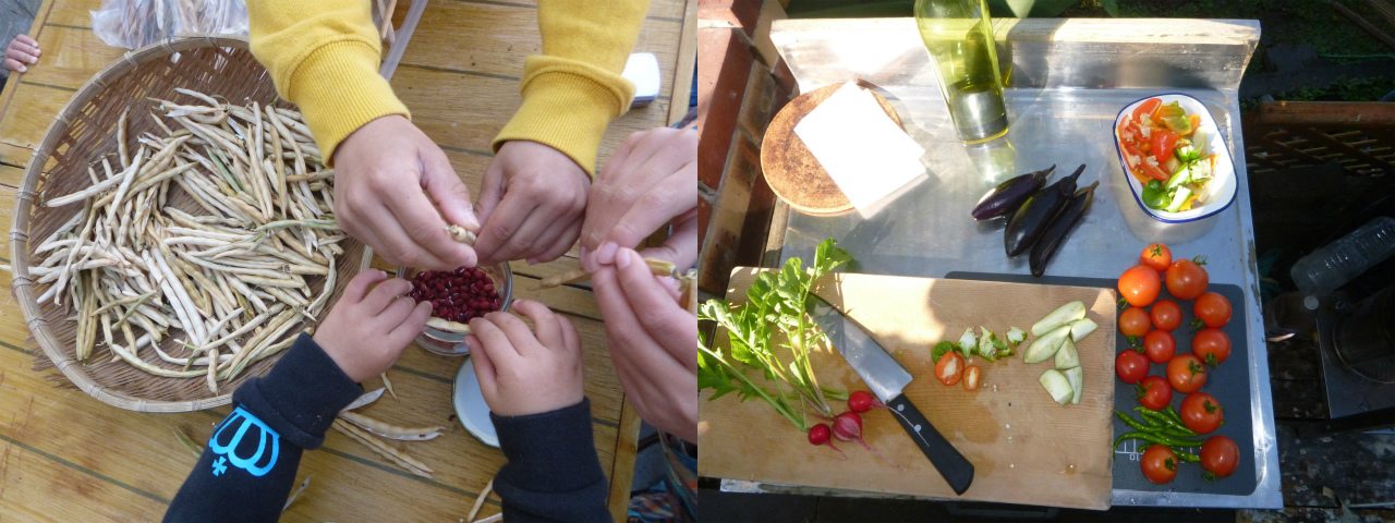 朝。全くもって社交性がないくせに、同じ地区の3児のお父さんに家で究極の卵かけご飯を作ろうぜと誘ったら3人連れて来てくれた。お釜とダッヂオーブンを薪火にかけないといけないので、まずは着火剤となる小豆の鞘剥きから。次に食べたい野菜を収穫。何故か後から、近所の子が2人増え、結構な人数の朝食会となった。