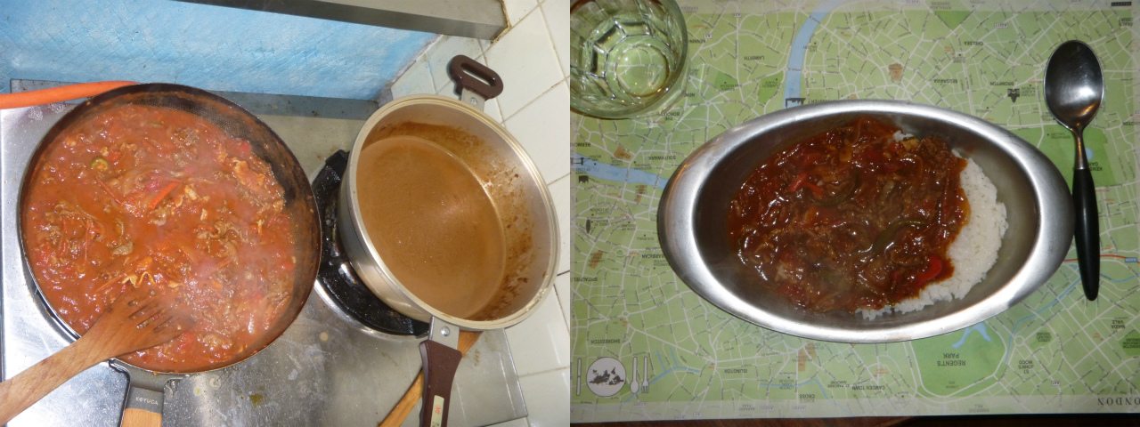 具材の鍋が単なるトマト煮として出しても充分に美味しくなったら、仕上げのブラウンソースを投入。この作り方、いつも何かに似てるなぁ〜って思ったら、ビーフシチューと大して変わらんやんけ。どうりで、70年代俳優の顔みたいな濃厚さ。