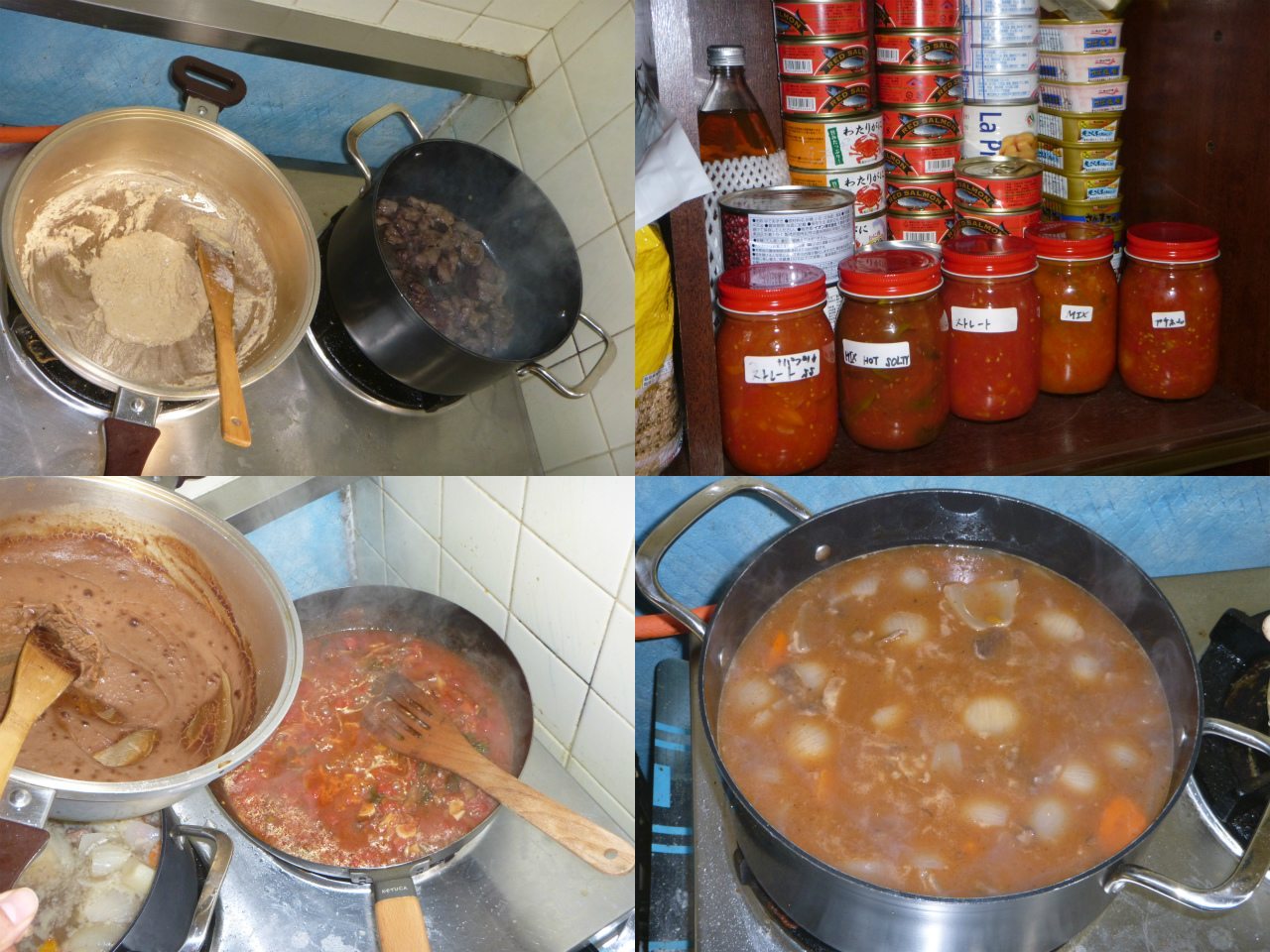 明日は小中高時代の友人達と恒例のクリスマス忘年会。今年は大ぶりビーフの代わりにスジ肉を使ってコストダウンした「なんちゃってビーフシチュー」を持ち込もう。と言う事で小麦をバターで炒め、ブラウンソース作りに入った所で問題が発覚。トマトがない。いやいや、買いに行くほどではないから、ストックしたヤツを使うわ。と、離れにトマトソースを取りに行くも、ダシに使うには余りにも勿体なくなって、結局、買いに行ってもらった。