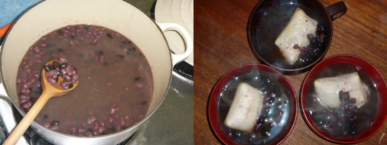 と言う訳で、乾燥させて瓶に溜めて置いた小豆二種を気長に煮込み、二色のぜんざい。