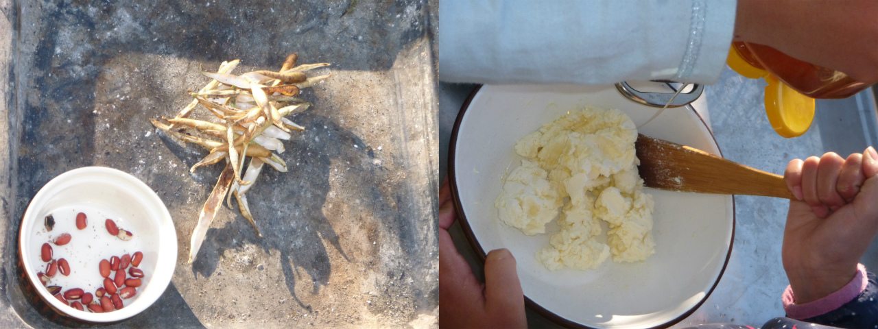 火種の確保。収穫漏れの小豆の残党から着火剤を得る。クリームチーズに卵と蜂蜜を混ぜ混ぜし、最後に生クリームを加えてもう一練り。