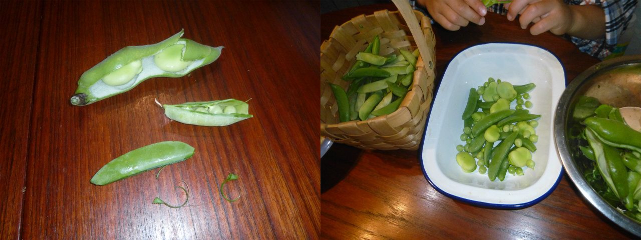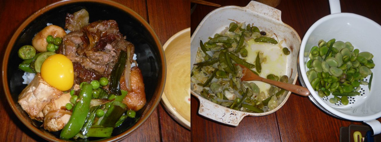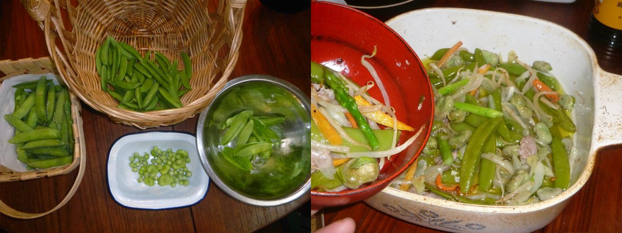 グリーンピース、スナップエンドウ、そら豆が採れるので、毎日、豆がおかず。沢山採れるのは良いが、剥くのが少々手間。