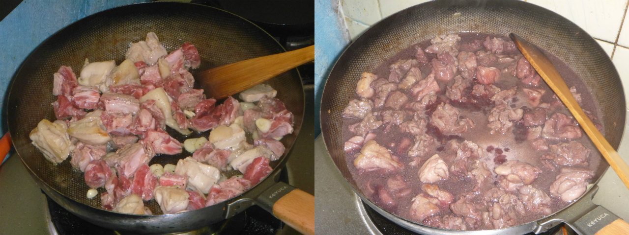 息子はんの幼稚園友達が日曜日にチェリー狩りに来るので、カレーを比較的丁寧にこさえた。まずは、肉を炒めて、ワインで煮込む。