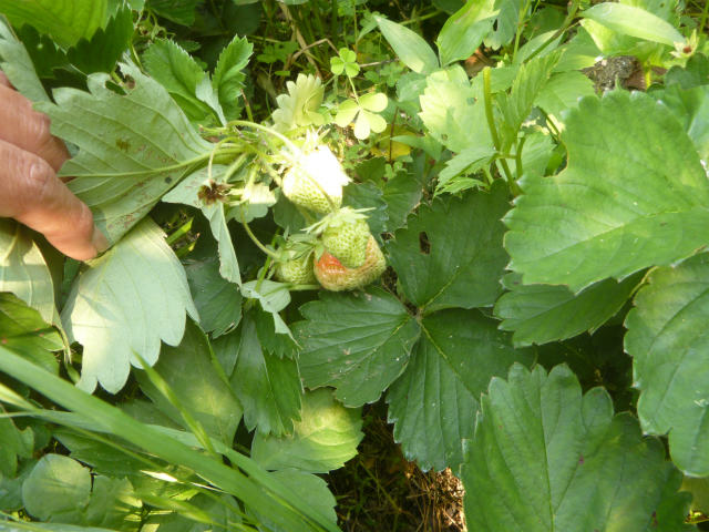 ダンゴムシなどの食害を気にしなければ、路地での苺の無農薬栽培は可能であるが、黴びやすいという欠点がある。水やりなどはせず、なるべく風通しをよくしてやらないといけない。また、地面に実が触れぬように、Y字の枝などで支えるか、ワンレンの人が髪をかき上げるように苺を持ち上げないといけない。5月22日(日)