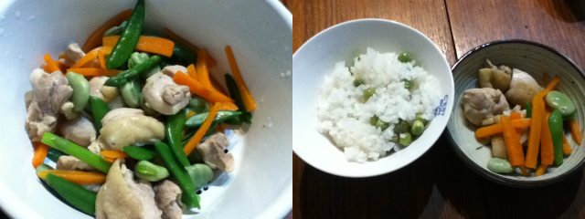 豆ご飯に具材を乗せ、そこへ完成したカレーをかける。