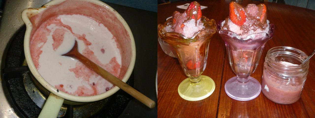 牛乳を砂糖で煮込み、練乳を作り、そこへ緩く煮た苺ソースを加えて苺練乳を作った。それをかき氷に苺と共にトッピングしたものが、本日のオヤツ。5月21日(土)