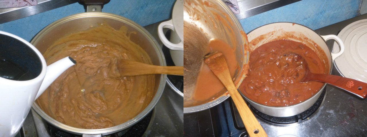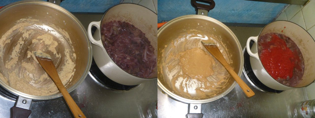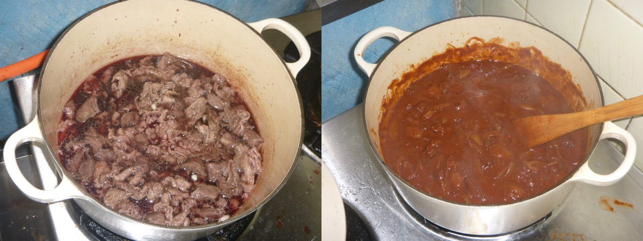 炒めた肉をワインで煮込む傍ら、バターで伸ばした小麦粉を茶色になるまで炒める。肉の鍋にトマトを流し込む。