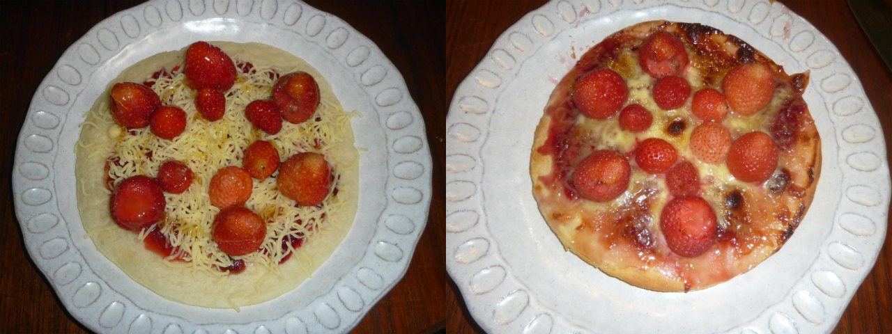 娘さんが発案した苺ピザにはまる。市販のピザ生地に、苺やラズベリーのジャムを塗ったくり、チーズを限界まで乗せてから、苺をトッピングして焼く。