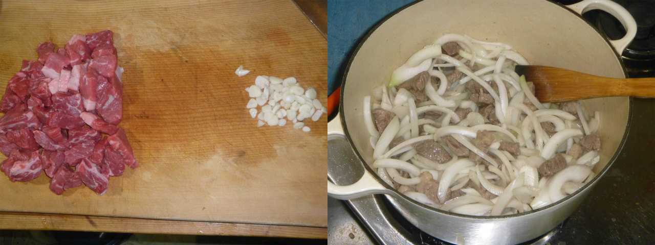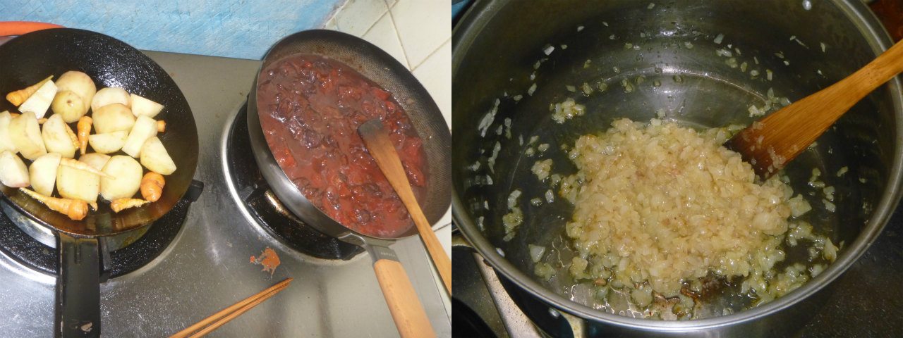 ジャガイモとニンジンを多めの油で揚げるように焦げ目が付くまで炒める傍ら、肉の鍋にトマトを流し込んで更に煮込む。タマネギを飴色になるまで炒める。