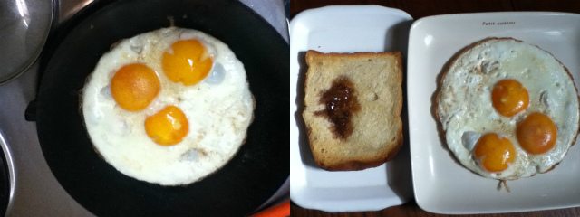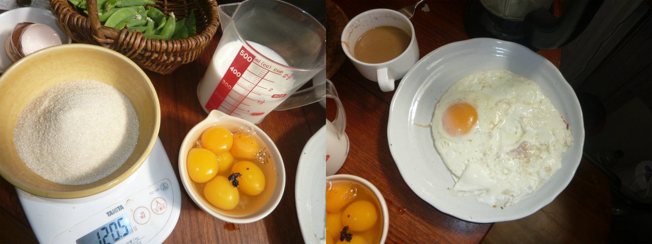明日はゼリーか何かが出るので、代わりにプリンを持たせようと、朝一でクレームブリュレ風焼きプリンをこさえた。副産物として白身が余るので、白身タップリの目玉焼きが朝食。