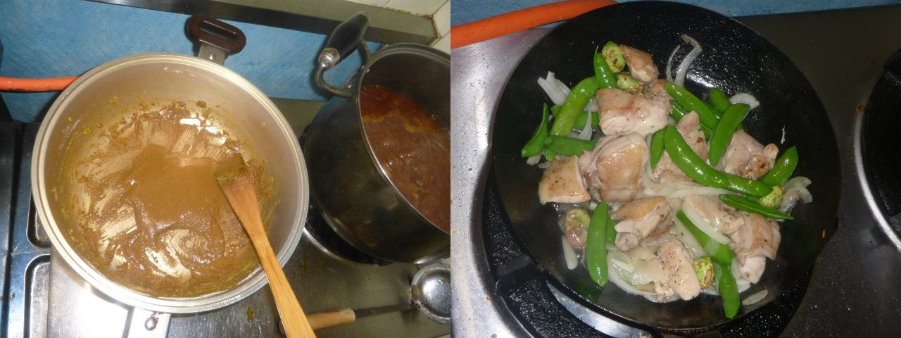 茶色くなった小麦粉をスープでのばし、肉類の鍋に流し込む。今回はトマトパックにクエン酸が沢山添加されていたようで、煮込んでも煮込んでも全く酸っぱさが消えず、結局、翌日、弁当を残してくる始末!