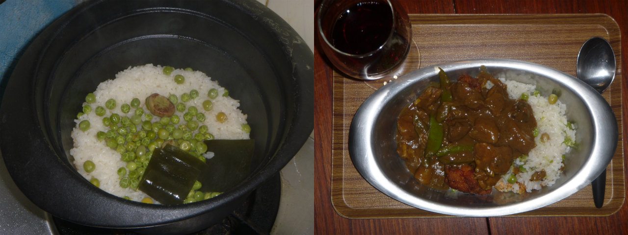 お釜で豆ご飯を炊く。豆ご飯に具材を乗せ、そこへ完成したカレーをかける。