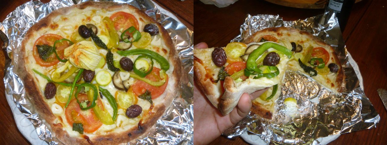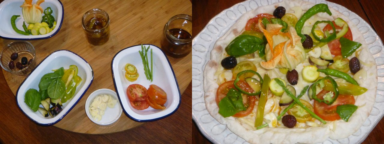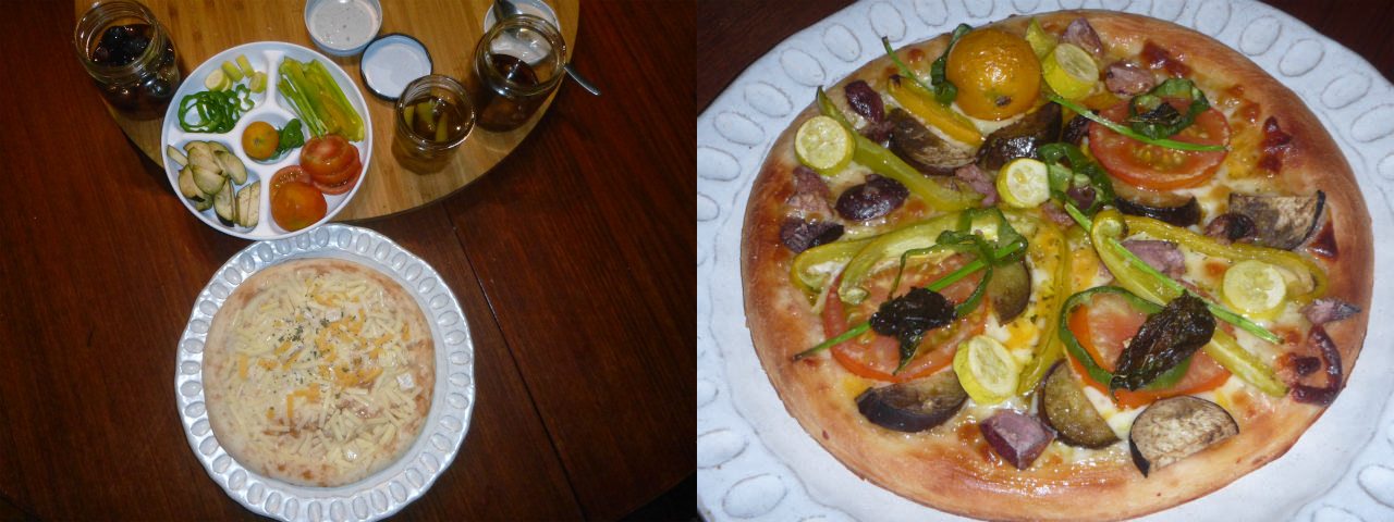 野菜を丁寧に処理し、昨年漬けたオリーブ、チョリソーとハモンセラーノのオイル漬けをおろし、自分一人しかいないのに、ターンテーブルまで引っ張り出して、トッピング。