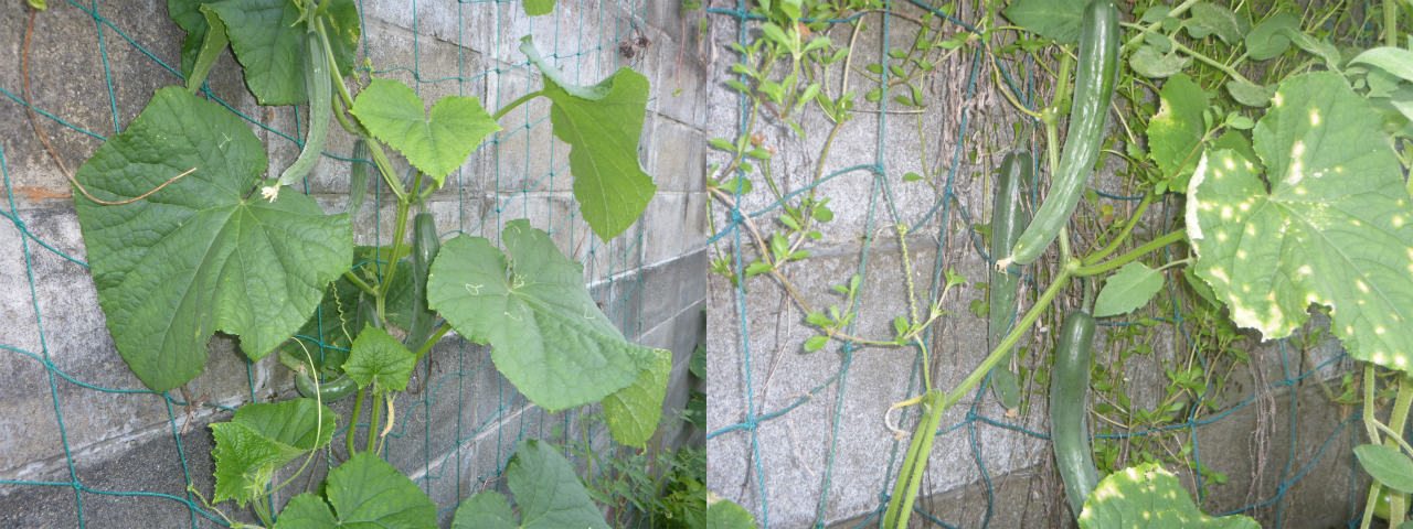 7月下旬の庭。すず成りキュウリというのを種から育てて植えてみたら、キャッチフレーズのように沢山採れた。3期に分けて植え付けた為、長い期間、楽しめる。キュウリ嫌いだがー。