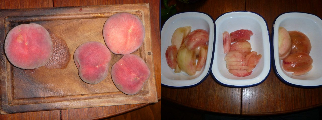 左、義母が買って来た近所の果樹園「みどろ園」産あかつき。右、我が家のあかつき。比べるまでもないが、プロダクトではないので虫害を恐れず、袋を外して完熟落下するまで日光に当てているため、如何なる桃よりも美味しい。