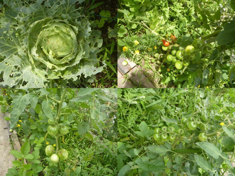 モンシロチョウの幼虫の度重なる食害に抵抗力を付けた適者なのか、この時期に無農薬なのにキャベツが育っていた。今年、トマトは5株しか買わなかった。後は種と脇芽から増やした物を植え付けた。株元には、マリーゴールドとバジル、枝豆の種を蒔いておく。