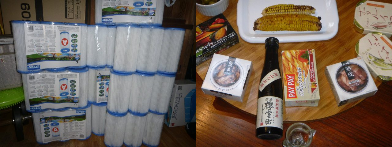 プールの浄水フィルターが1個あたり80円位だったので買い込んだが、後に倉庫に1年分ストックしていたのを見つけてしまった。夜。近くのスーパーボンマルシェに飲みきりサイズの日本酒が売られているのを発見したので、缶詰de飲み会。