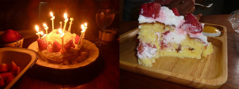 ケーキはセルフで娘さん作。スポンジの焼き加減を少々失敗したが、この時期の苺は巨大で芳醇なので、お味はまずまず。