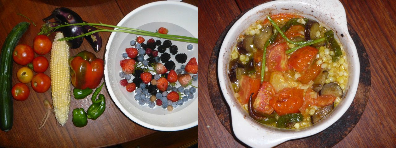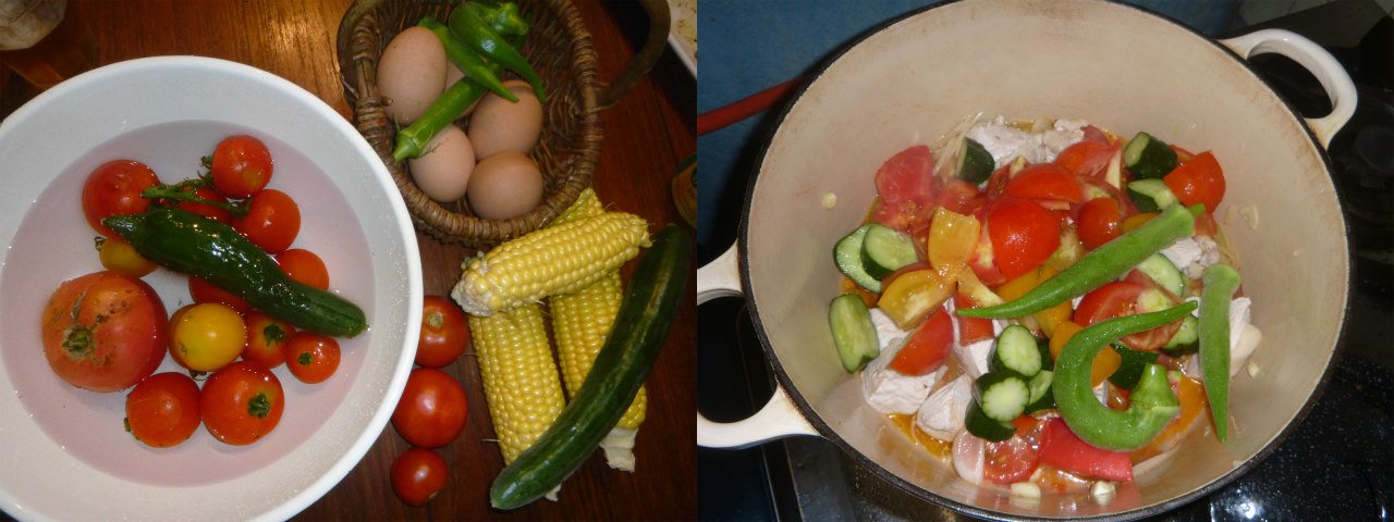 キュウリなど採れた物は何でも放り込んで、ニンニクタップリのアヒージョにする。油+色素で、リコペンやカロチンを大量に摂取できる。7月12日(火)