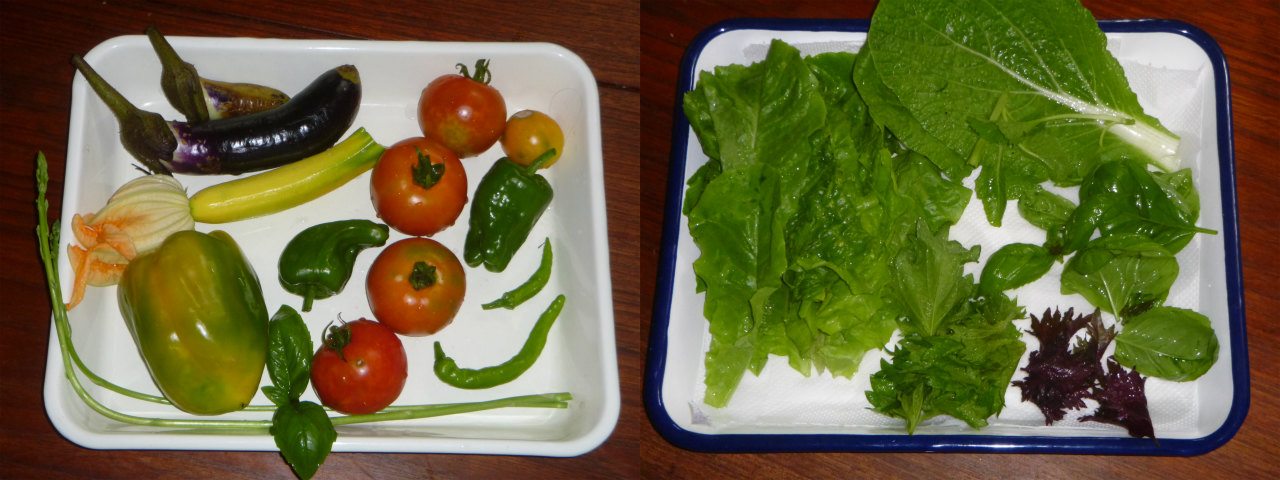 キュウリなど採れた物は何でも放り込んで、ニンニクタップリのアヒージョにする。油+色素で、リコペンやカロチンを大量に摂取できる。